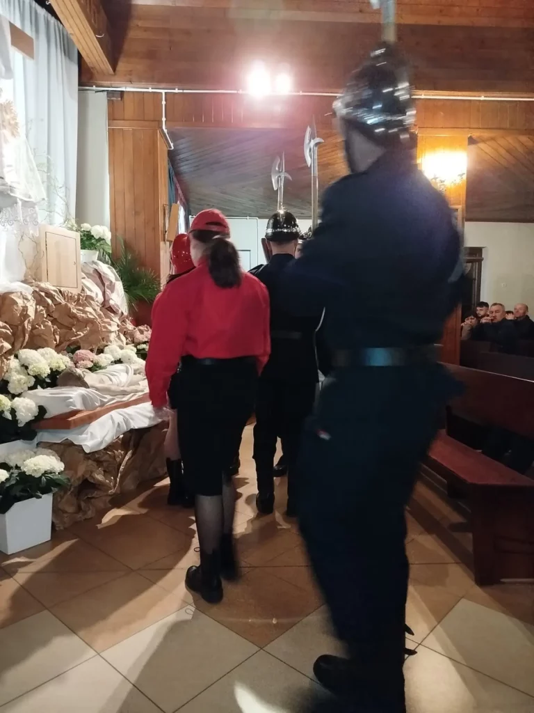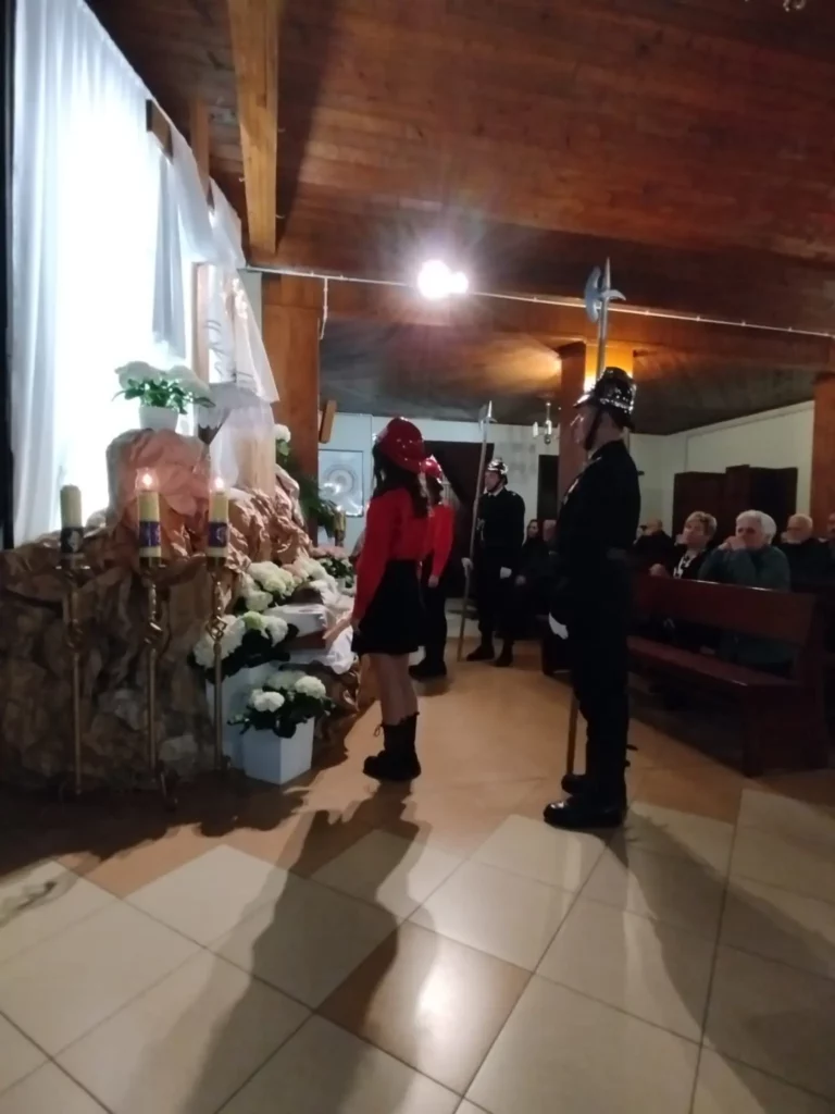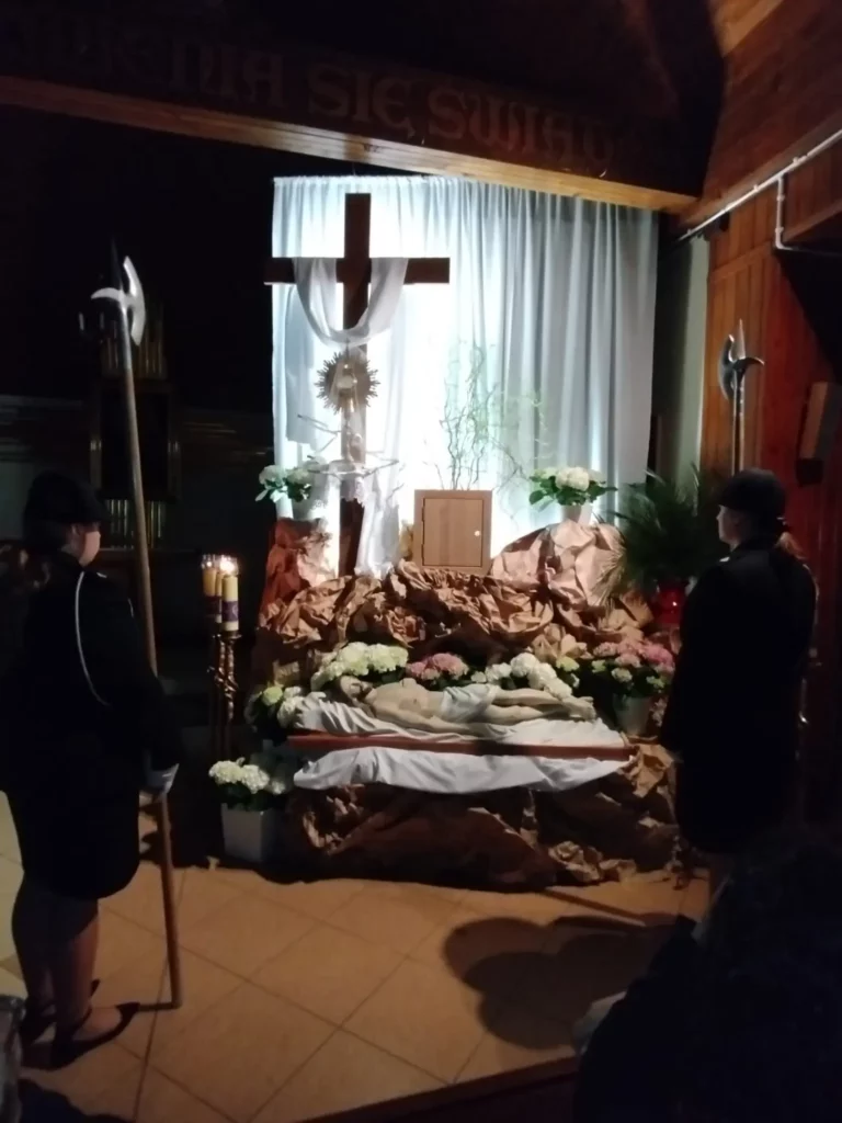 Wielki Piątek – dzień Męki i Śmierci Pana Jezusa – rozpoczęliśmy nabożeństwem Drogi Krzyżowej. Następnie uczestniczyliśmy w Liturgii Męki Pańskiej, podczas której wysłuchaliśmy śpiewu Męki Pańskiej, adorowaliśmy Krzyż naszego Zbawiciela oraz przyjęliśmy Komunię Świętą. Na zakończenie przeżywaliśmy symboliczny pogrzeb Pana Jezusa i złożenie Go do Grobu. Przy Grobie Pańskim wartę pełnili tradycyjnie druhowie Ochotniczej Straży Pożarnej w Chojniku. Po liturgii chór parafialny wraz ze zgromadzonymi wiernymi odśpiewał trzy części Gorzkich Żali.