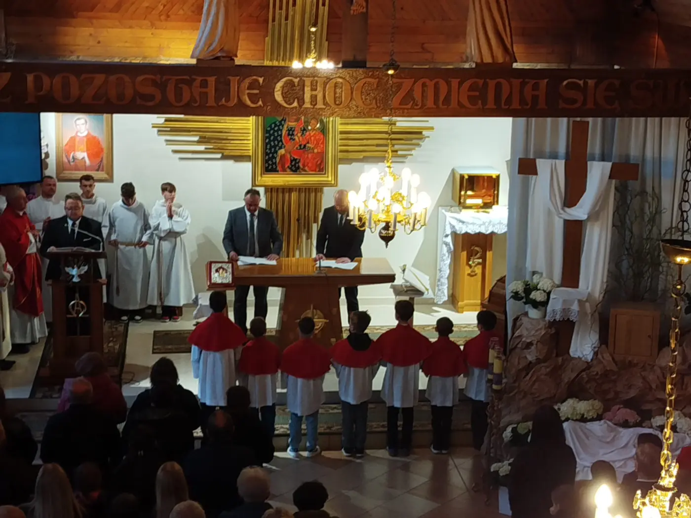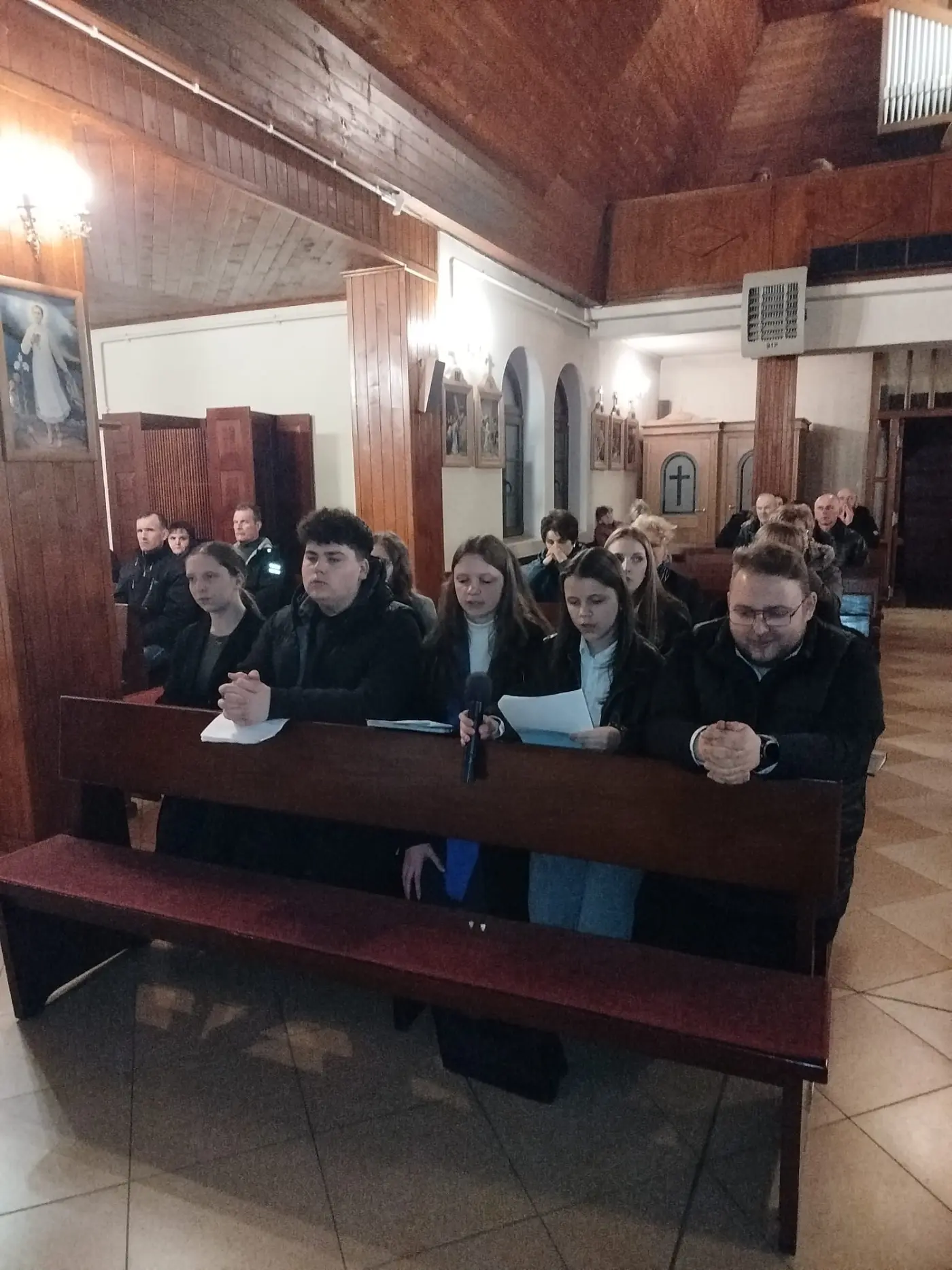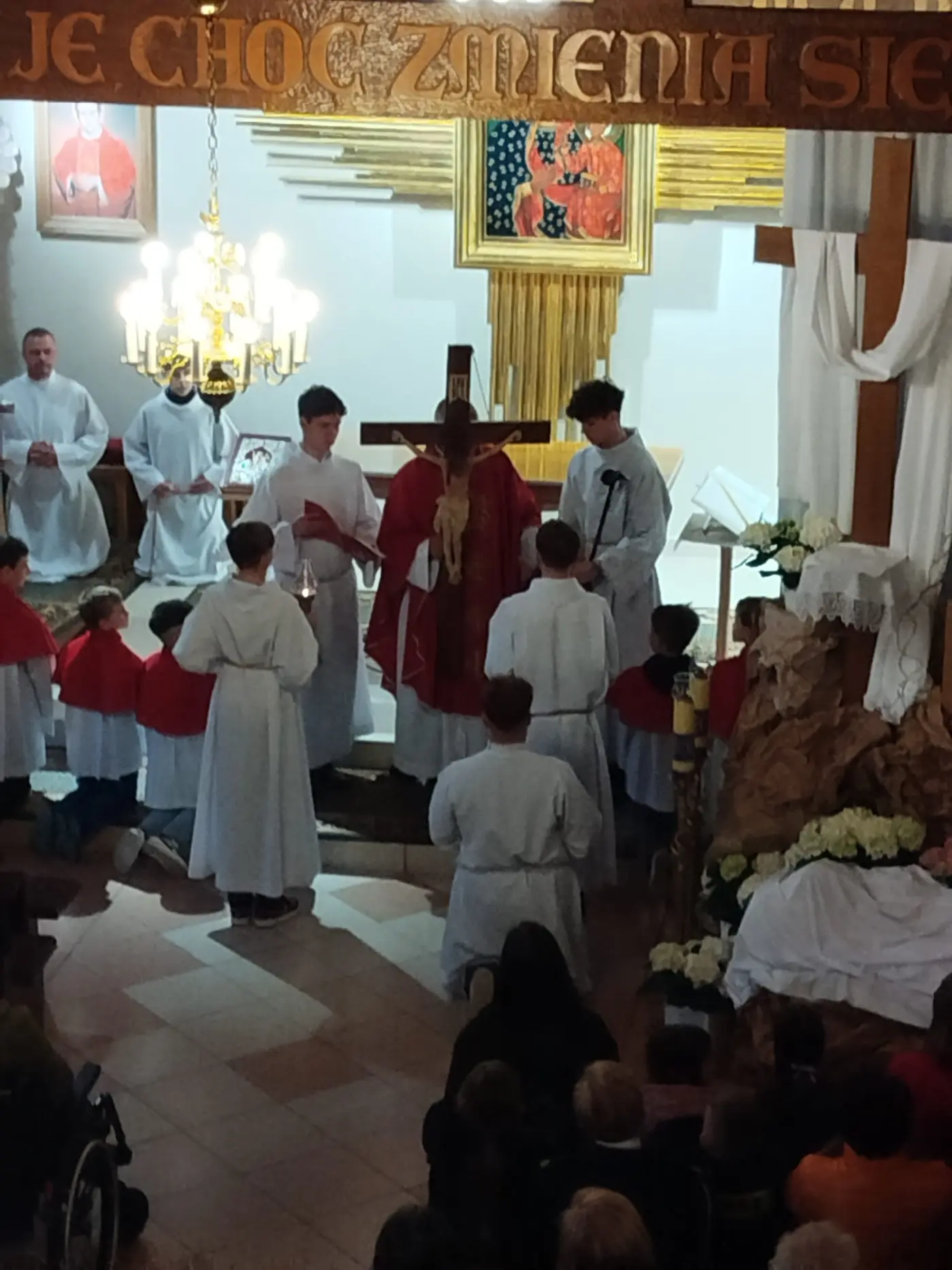 W Wielki Czwartek zgromadziliśmy się na Mszy Świętej Wieczerzy Pańskiej. Uczestnicząc w Eucharystii, dziękowaliśmy Panu Jezusowi za dar Sakramentu Eucharystii i Kapłaństwa. Po zakończeniu liturgii Najświętszy Sakrament został przeniesiony do Ołtarza Adoracji, zwanego Ciemnicą. Adorację poprowadziła młodzież, rozważając w obecności Pana Jezusa tajemnicę Bożej Miłości objawionej w Eucharystii oraz odpowiadając na Jego wezwanie „Czuwajcie”, towarzysząc modlitwą opuszczonemu przez wszystkich Zbawicielowi.