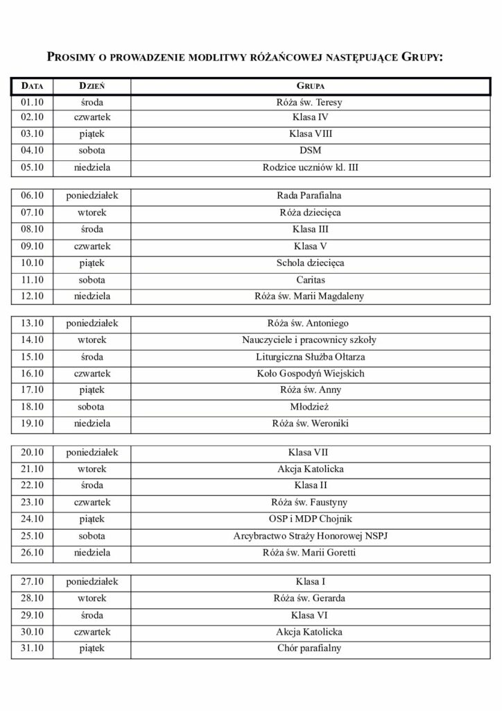 - Nabożeństwo Różańcowe codziennie o godz. 17:00, a w niedzielę o godz. 10:30. „Bóg zapłać” wszystkim grupom, które w ubiegłym tygodniu prowadziły Różaniec: Różom św. Antoniego, św. Anny i św. Weroniki; nauczycielom i pracownikom szkoły; LSO, KGW „Chojniczanki” oraz Młodzieży. Na przyszły tydzień bardzo proszę kolejne grupy, zgodnie z harmonogramem umieszczonym w gablocie i na stronie internetowej naszej parafii. Zapraszam wszystkich do uczestnictwa w tym Nabożeństwie.